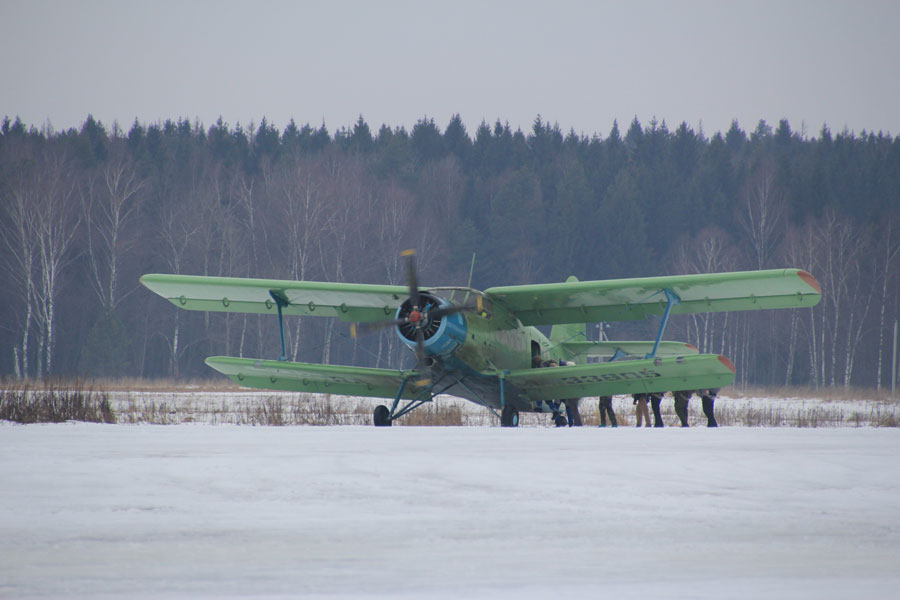 Разбрызгивая снег и воду, Ан-2 идет на взлет.