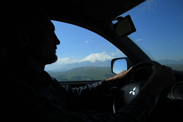 Валера уверенно ведет колонну, а за окошком просматривается Эльбрус.