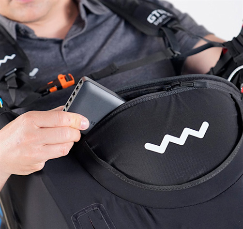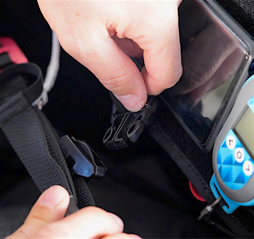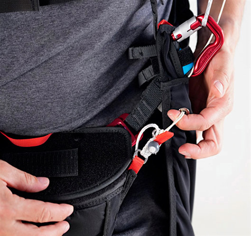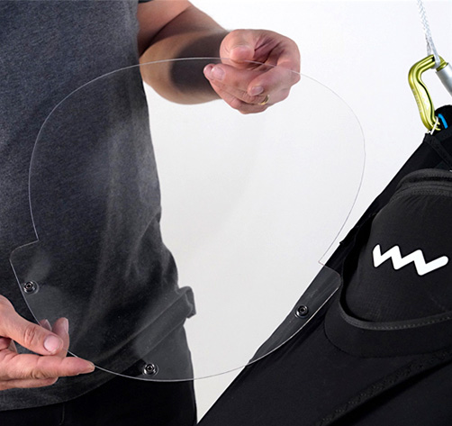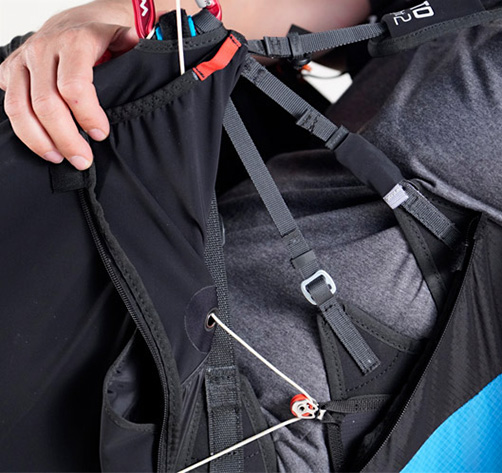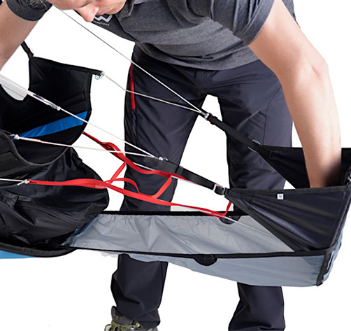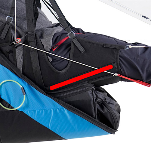 Кокпит прикреплен к нагрудному ремню с помощью пряжки, позволяющей регулировать угол наклона приборной панели